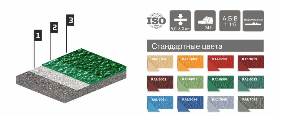 1. Грунтовка Литакрил Прайм 2. Лицевой слой Литакрил Оптима* с цветными чипсами** 3. Полиуретановый матовый лак Декоративное покрытие толщиной 4,0-7,0 мм., эксплуатируемые в производственных условиях с интенсивной пешеходной нагрузкой, движением транспортных средств и погрузчиков.