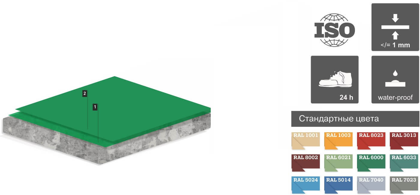 1. Грунтовка Литакрил Прайм 2. Лицевой слой Литакрил Эконом Гладкое наливное покрытие толщиной 1,5-3,0 мм., эксплуатируемое в производственных условиях с интенсивной пешеходной нагрузкой и небольших транспортных нагрузках (в том числе движение вилочных погрузчиков).
